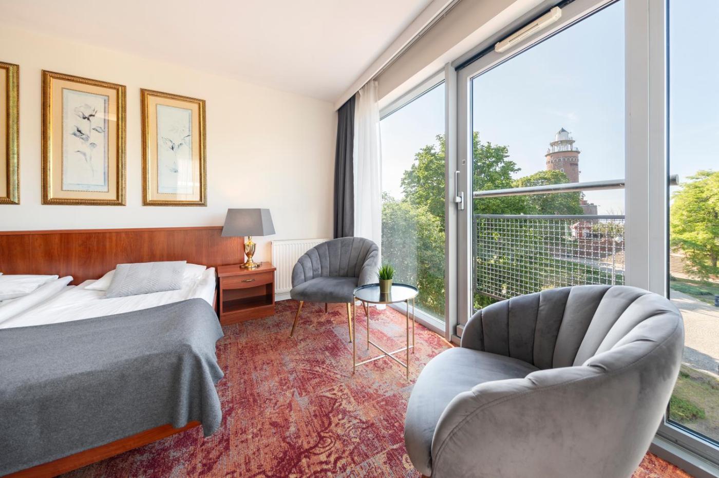 Apartament z balkonem. Apartament ten mieści 2 salony, 2 oddzielne sypialnie oraz łazienkę z prysznicem i suszarką do włosów. W kompletnie wyposażonym aneksie kuchennym przygotowano płytę kuchenną, lodówkę, przybory kuchenne i czajnik elektryczny. Apartament ten dysponuje balkonem z widokiem na cichą ulicę, podłogą wyłożoną wykładziną oraz telewizorem z płaskim ekranem. W tej opcji zakwaterowania do dyspozycji gości są 2 łóżka. Apartament - 4 osobowy. Powierzchnia pokoju ok.: 35 mkw. ;