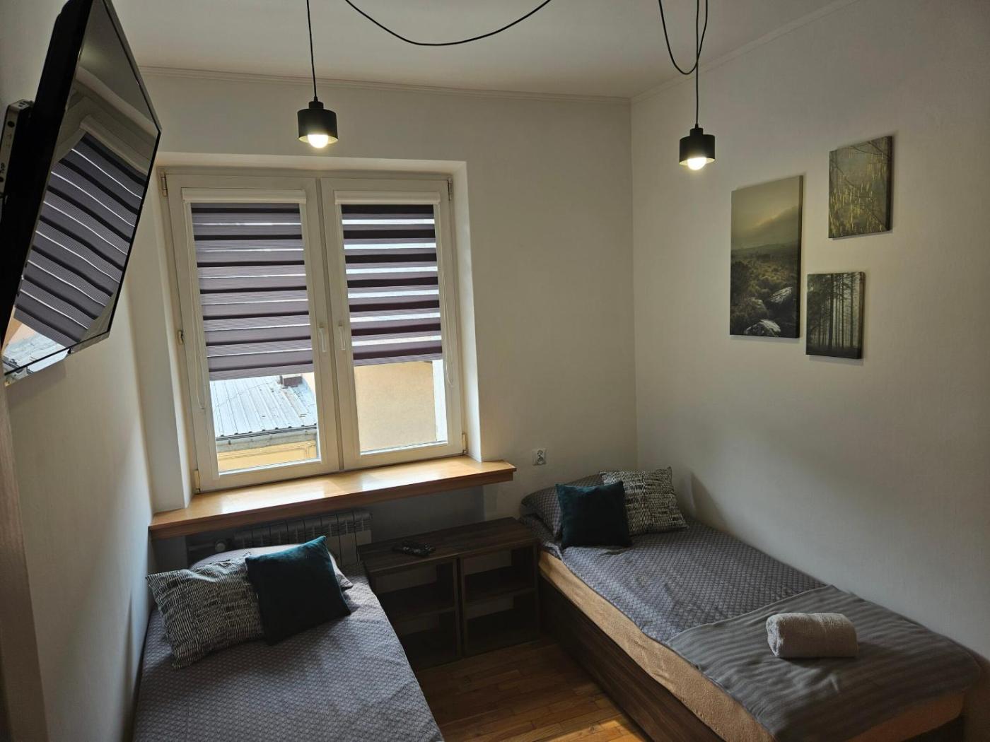 Pokój Trzyosobowy ze wspólną łazienką. The triple room features a wardrobe, as well as a shared bathroom boasting a shower. This triple room offers a flat-screen TV. The unit has 3 beds. Pokój Trzyosobowy - 3 osobowy. Powierzchnia pokoju ok.: 16 mkw. ;